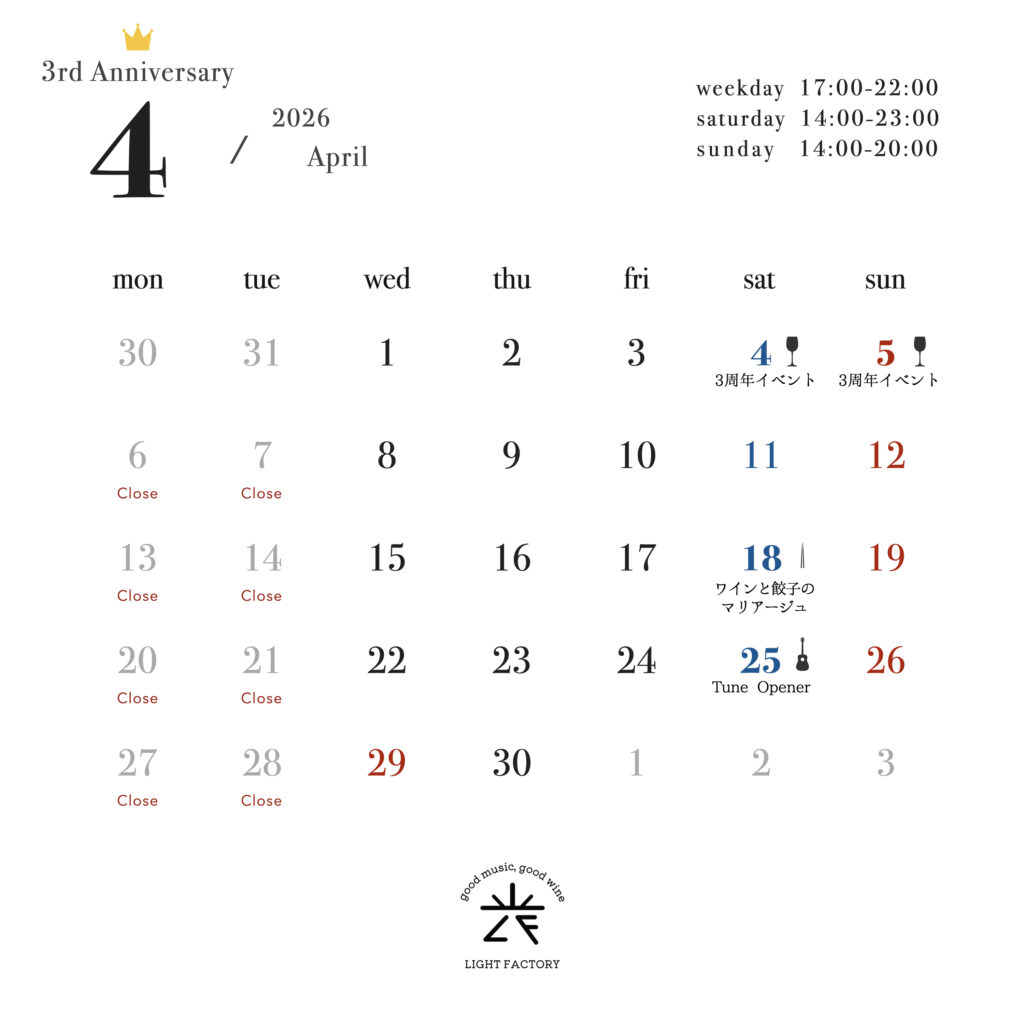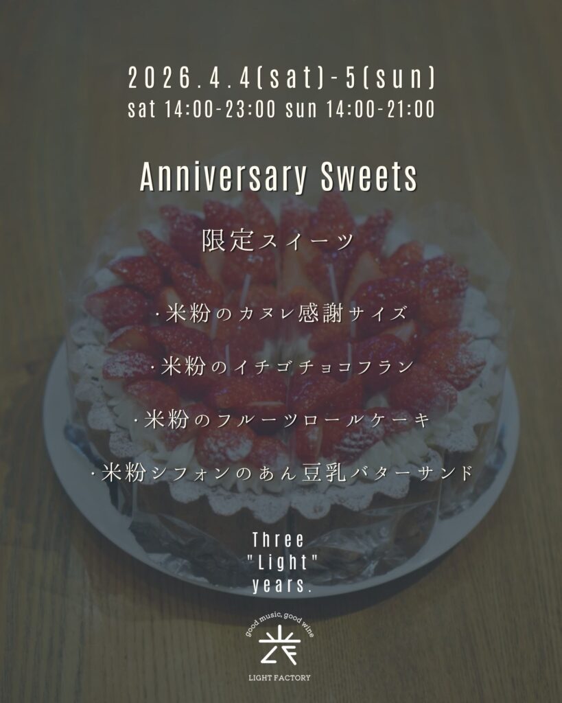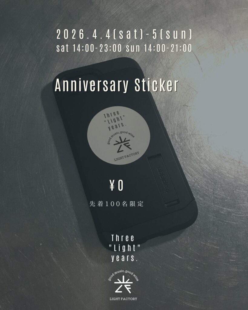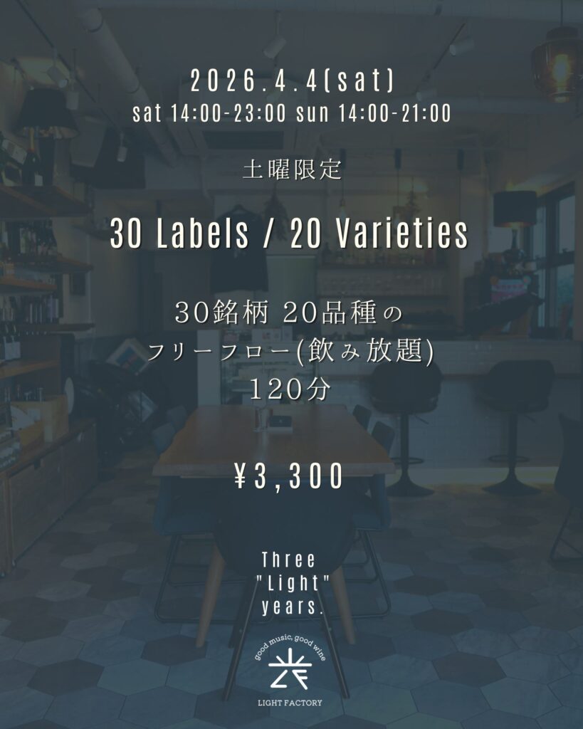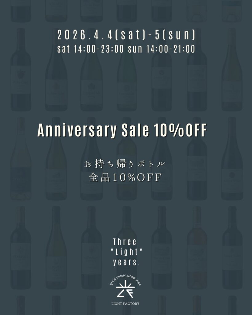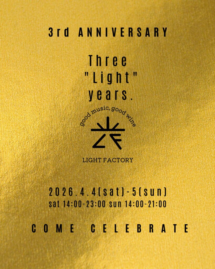 light_factoryyy Good music & Curated wines 🍷 Artisanal cannelés & sweets 🍰 weekday: 17-22 sat: 14-23 / sun: 14-20 closed: mon, tue 西武池袋線 東長崎駅 北口 徒歩1分 3rd Anniversary / Three "Light" years. おかげさまで、LIGH おバカなことに、 周年イベントで配布予定のステッカー、 綴りで注文してたみたいで、 個別にお渡しでき LIGHT FACTORY 3周年トートバッグ 33枚限定 ¥3,300 しっかり厚手の12オンス。 ご縁があって東京・東長崎に店をオープンし、まもなく丸三年が経とうとしています。 「うまくいかなかっ 今週末の1本 春目前、本格ロゼ。 いちごショートやフランにもぴったり。 もちろんワインだけでも👌 お客様と 「看板できたんですよ!」 「聞いたよ笑」 を繰り返しています Save the date: 04.18 SAT 詳細は改めてお知らせいたします! @light_ 週末限定グラス オッチサイダリーさん @occicidery.okinawa の沖縄県産シークヮーサ 今週末の一本。 2023 アイ.ブランド&ファミリー ペイザン ロゼ セントラル・コースト 限定7杯 今週末の1本 2021 マサイアソン タンデュ レッド・ワイン ダニガン・ヒルズ 7杯限定 ¥900 現在のメニューです。 Current Menu. 今週末の一本 2023 アイ.ブランド&ファミリー ラ・マレーア アルバリーニョ クリスティ・ヴィン 今週の一本 2022 タトーマー スタインヒューゲル リースリング サンタ・ルシア・ハイランズ 10 《明日!》 LIGHT FACTORY 初のオリジナル赤ワイン 《ライトファクトリーレッド 202 カキとワインと、時々アナタ vol.2 LIGHT FACTORY @lightfactory202 LIGHT FACTORY red vin.2025 Release: 2.14 (Sat) G 2026.3.10 (Tue) ROOM vol.8 at LIGHT FACTORY 18:00 オリジナルワインの瓶詰めが無事に終わりました。 今回は初の赤ワインです。 2/1 ご予約開始 2 CATch the Sound 2/22(Sun) @ LIGHT FACTORY 2月22日、猫 唯一無二のラッパーという呼び名が相応しい、 小林勝行氏のドキュメンタリー映画、 「寛解の連続」の上映 さらに読み込む Instagram でフォロー